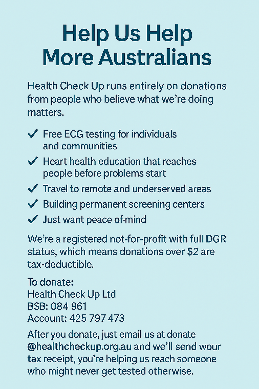 Our founder had a heart scare that came out of nowhere. No warning signs. No family history. Just a regular day that suddenly wasn’t. That experience opened our eyes to something troubling: across Australia, too many people—especially in remote areas, high-stress jobs, or disadvantaged communities—never get basic heart screening that could save their lives.